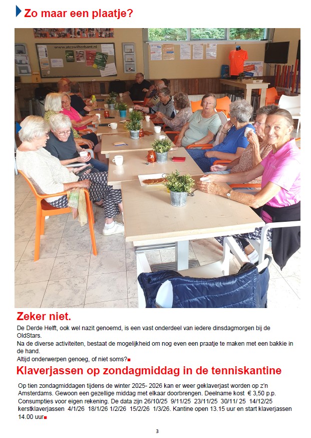 Wellicht is het goed om te benadrukken, dat de Derde Helft in onze kantine een vrije inloop kent van 9 tot 12 uur!