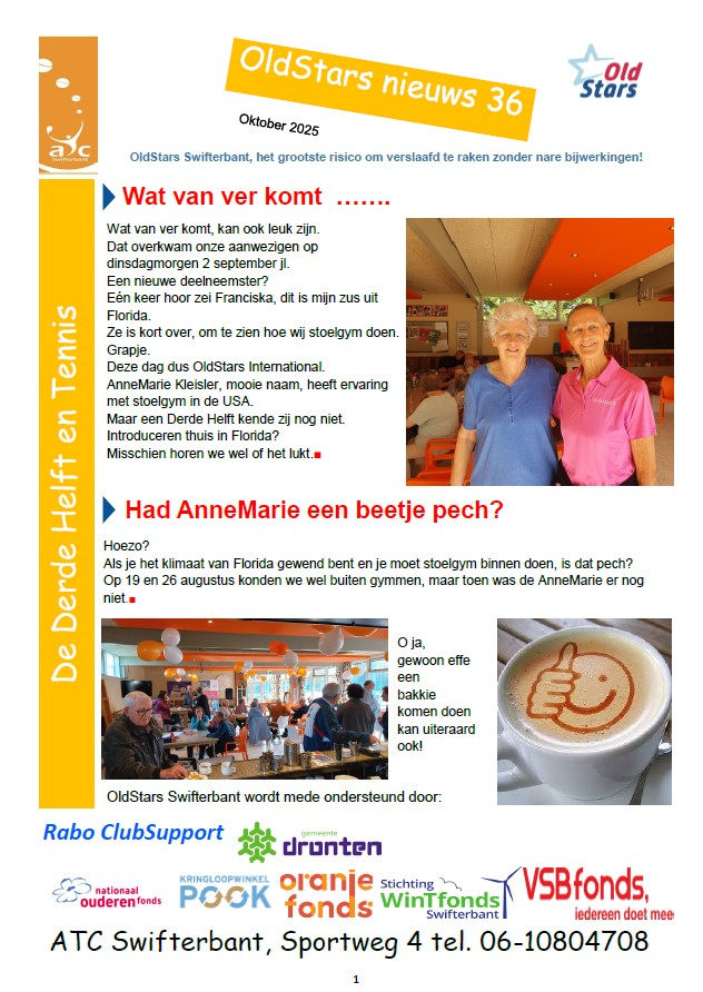 Het is de bedoeling om m.i.v. april 2023 daadwerkelijk iets te gaan betekenen voor de 55 plus bevolking van Swifterbant. Dit met ondersteuning en controle van het Nationaal Ouderen Fonds. Het lijkt misschien wat vreemd als wij dit zo schrijven, maar u als tennislid behoort niet tot onze doelgroep, hoewel ook ex leden in uw omgeving uitgedaagd kunnen worden om het opnieuw te gaan proberen. Toch bent u als leden wel heel belangrijk voor ons, namelijk het doel dat wij willen bereiken kan niet mede zonder uw hulp! Wat willen wij als vrijwilligers van onze club bereiken? Het idee is om onze 55+ bevolking die meer wil bewegen, de mogelijkheid te bieden om op ons park onder deskundige leiding lekker in de buitenlucht bezig te zijn. Een lidmaatschap is niet vereist. De financiële bijdrage die gevraagd gaat worden zal heel klein zijn. Daarnaast willen wij het fenomeen “De Derde Helft” introduceren. Tijdens de wekelijkse ochtend waar van de exacte dag nog bepaald gaat worden, bieden wij dan in de kantine de mogelijkheid om een kop koffie te drinken, met elkaar een praatje te maken en indien gewenst een spelletje te doen zoals kaarten, sjoelen, darten en jeu de boules. Wij gaan u in de komende nieuwsbrieven op de hoogte houden van onze vorderingen. Weet u mensen in uw omgeving die volgens u in aanmerking zouden komen om bij ons in de buitenlucht te gaan bewegen? Spreek ze aan en vraag hun naam en telefoonnummer of mailadres. Zie voor meer informatie onze flyer in de bijlage! Onze werkgroep pakt het verder op. Met vriendelijke groet, Jan de Klerk, voorzitter werkgroep OldStars ATC Swifterbant.